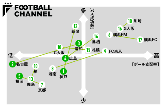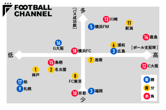 J1第7節の「Jの十字架」(図2)を見ればわかるように、お互い位置こそ十字に寄っているものの、横浜FMと横浜FCの距離は相変わらず近い。そう、ともにこれまでのコンセプトを貫き、がっぷり四つで組み合ったことがわかる。しかし、久々にお互いの良さを真正面からぶつけ合える状況だったにもかかわらず、横浜FCは0対5と大敗を喫してしまった。元横浜FMのジョン・ハッチンソンをヘッドコーチに招聘したように、横浜FCのやりたいサッカーは確かに伝わってくる。ただ、“兄貴分”横浜FMに言わせれば、「がっぷり四つで挑むなんて、なんておこがましいのか」といったところだろう。