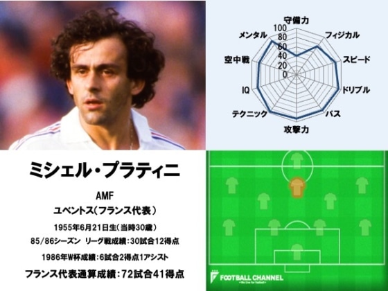最高評価となったのは「テクニック」。プラティニは178cm、74kgと恵まれた体格とは言えず身体能力が特別に秀でていたわけではなかったが、この圧倒的な技術によって世界最高峰の選手となった。