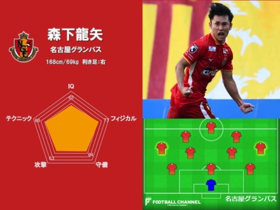 森下龍矢は堅守速攻を武器に上位争いに食い込む名古屋グランパスのサイドを担う。開幕当初は右サイドでの起用が多かったが、4月以降は左サイドを主戦場に活躍しており、すでに昨季を上回る2得点をマークしている。