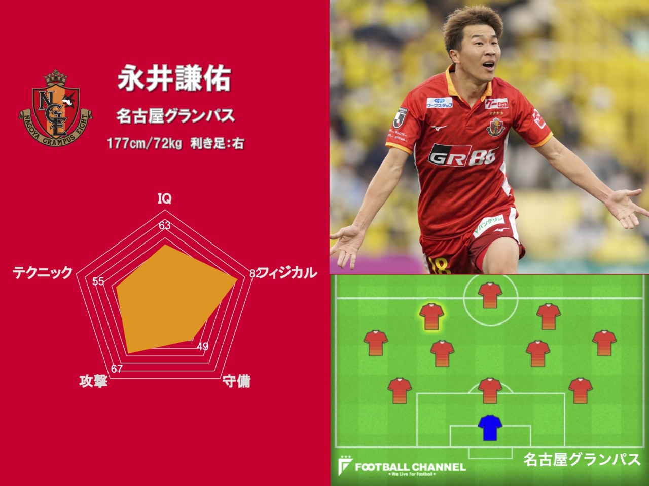 日本代表にも選出された経験を持つ永井謙佑は昨年、約5年半ぶりに名古屋グランパスに復帰。FC東京時代にも指導を受けた長谷川健太監督の下ですぐに主力となり、結果を残した。その永井は34歳となった今季も不動の存在として攻撃陣を牽引し、好調・名古屋を支えている。