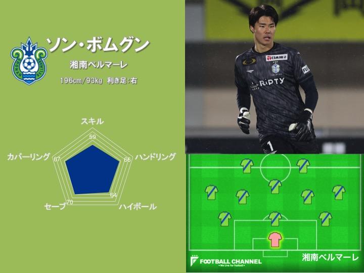 ただ、Jリーグではまだソン・ボムグンのポテンシャルを100%発揮できていないかもしれない。本来はキックの技術に長けたGKだが、湘南ではより確実な選択肢を取る傾向がある。安全に蹴りだす場面も多く、「スキル」はやや低めとなった。味方との連係が成熟して判断に迷いがなくなってくれば、キム・ジンヒョンら歴代の韓国人GKに肩を並べる存在になるだろう。