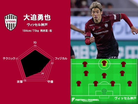 首位を走る神戸では3トップの中央で起用され、既に昨季を上回る9得点を挙げている。ゴールパターンが豊富で決定率も28.1%と高く、さらに1試合平均のチャンスクリエイト回数はリーグ5位の2.8回。得点力に加えて、チャンスメイクの部分でのクオリティの高さが、「78」を記録した「攻撃」の高さにつながった。「スキル」も高く、敵陣でのパス成功数はFW登録でダントツの323回をマークしている。