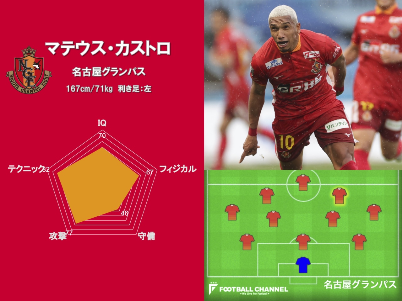 長くJリーグで活躍している外国籍選手の1人がマテウス・カストロだ。大宮アルディージャで日本キャリアを始めると、2019年から現在に至るまで身を置く名古屋グランパスでは崩しの核に。クラブ史上初のYBCルヴァンカップ制覇を筆頭に、様々な部分で貢献してきた。