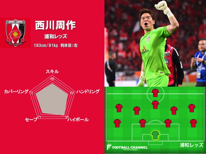 自己最高値となったのは「ハイボール」の項目。身長は183cmでGKとしては小柄な部類だが、クロスキャッチ成功率はリーグ最高の40.4%を記録している。判断を間違えることも少なく、ピンチを未然に防いだ回数は数えきれないほど。浦和は1試合平均の被シュート数は10.1本でリーグ4番目に少なく、こういった西川の対応がそれをアシストしている。