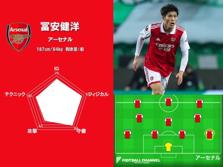 DFながら足元の「スキル」もしっかりとしている。特筆すべきは左右両足を遜色なく使いこなすことで、アーセナルでは右だけでなく、左サイドをカバーすることもある。果敢な仕掛けやオーバーラップ等、「攻撃」全般のクオリティーは落ち、それがクラブでベン・ホワイトに1番手を譲っている理由でもあるが、日本人史上最高レベルのDFということに疑いの余地はない。