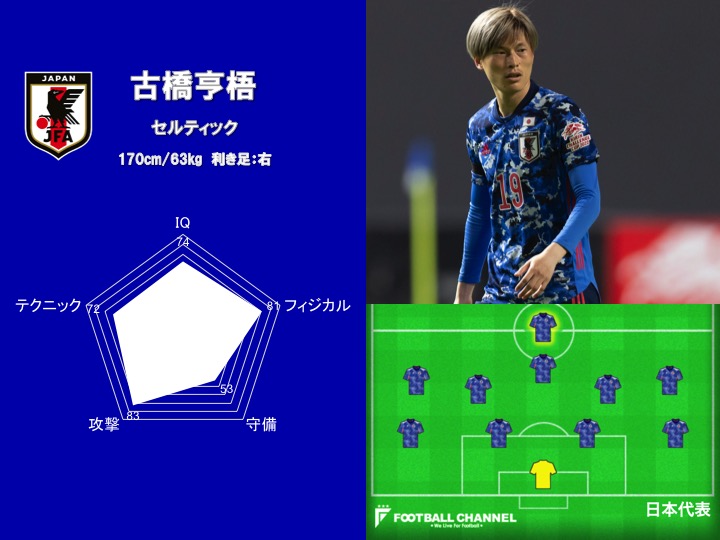 フィニッシャーとしての能力は申し分なく、セルティックで2年間師事したアンジェ・ポステコグルー監督は古橋の特徴を最大限に活かしていた。一方、試合展開や出し手との相性次第で試合に消えてしまうこともある。日本代表ではまだ本領発揮に至っていないのは、要求されるタスクの種類が一因なのかもしれない。