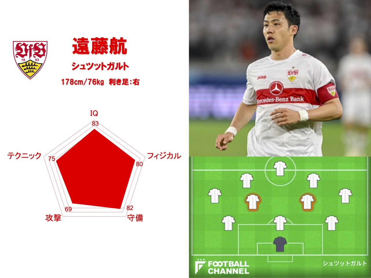 パスやテクニックで違いを作り出すタイプではないため「スキル」は飛び抜けなかったが、昨季はキャリアハイのリーグ戦5得点5アシストを記録するなど、「攻撃」は守備的MFの中ではトップクラス。とくに大事な時期の勝負強さは異次元で、昨季は残留に向けラストスパートをかけた4月以降だけで2得点3アシストを記録していた。遠藤がいなければ、クラブの残留はなかったはずだ。