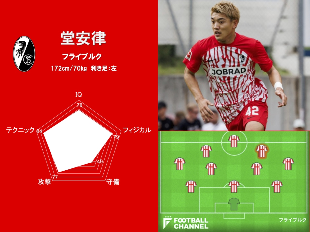カタールW杯、東京五輪など、大舞台やここぞという場面での得点力や勝負強さも光る堂安。しかし、これまでのキャリアにおいてリーグ戦1シーズンで2桁得点に達したのはガンバ大阪U-23でプレーした2016シーズンのみであり、継続的にゴールを奪うという点は今後の課題となっている。そのため「攻撃」の数値は「77」で、トップ10にいる攻撃的選手の中ではワーストとなった。