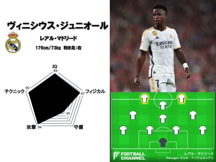 10代でレアル・マドリードにやってきたヴィニシウス・ジュニオールは、今や世界で3番目に市場価値(1億5000万ユーロ)が高い選手だ。今季からはラウール・ゴンサレスやクリスティアーノ・ロナウドらが背負ってきた伝統の7番を継承。カリム・ベンゼマがいなくなったこともあり、これまで以上に期待されているのは確かだろう。