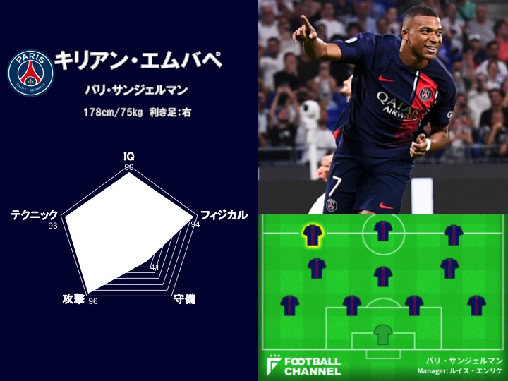 エムバペは、フォワードに必要な能力の全てが高水準で揃った選手だ。「攻撃」、「スキル」、「フィジカル」、「IQ」のどれをとっても、各項目のトップ数値に肉薄する能力値を叩き出している。同選手は抜群のスピードを生かしたシンプルな仕掛けと、トリッキーなフェイントを織り交ぜたドリブルを自由に使い分けることができ、1対1で彼を止めるのは至難の業。シュート技術も素晴らしく、振り向きざまの難しい体勢からのシュートも巧みなボディコントロールでお手の物としている。