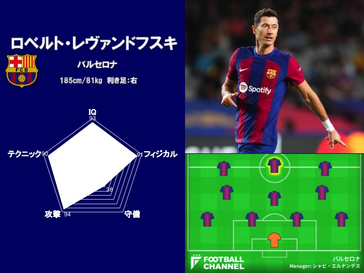 一方でランキング上位に入った他の選手と比較すると、少し低く見えるのが「守備」の能力値。同選手はよい意味でも悪い意味でも生粋のストライカーであり、前線からの守備には若干緩さがある。あと少し「守備」の数値が高ければ、トップ5に入っていただろう。