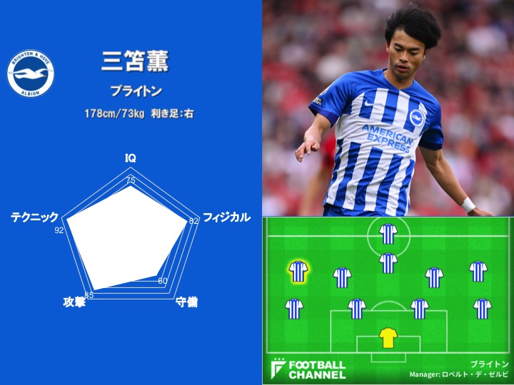 三笘と言えば、スピード感あふれるドリブル突破が魅力的だ。これを可能にする「スキル」の数値は「91.6」とトップレベルのものとなっている。2022/23シーズンのプレミアリーグで7得点6アシストという数字は十分に立派なものだが、今季は7試合ですでに3得点3アシストと大暴れ。「攻撃」は「85.6」となっている。