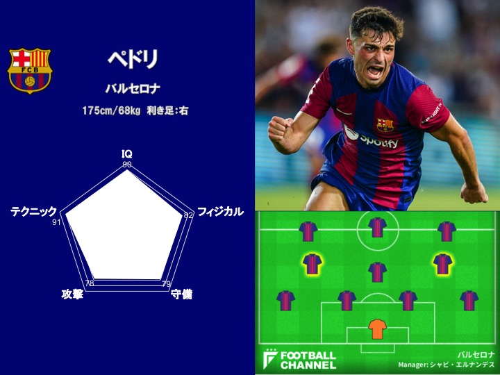 それに加えて高いパス能力を持っているのもペドリの魅力。昨季は平均ロングパス成功数(4.3本)、平均キーパス数(1.7本)ともにチームトップの結果を叩き出した(データサイト『Sofa Score』参照)。どこに立ち、どこへパスを出すべきかを完璧に心得ているため、ペドリ1人の存在がバルセロナの攻撃に好循環をもたらす。