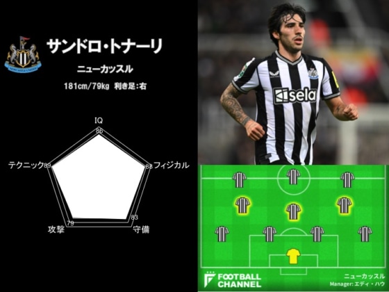 今年夏の移籍市場でACミランからニューカッスルに移籍したサンドロ・トナーリが9位にランクインした。