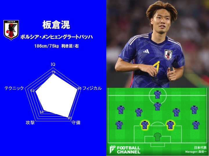 ボランチでもプレー可能なほど足元の技術に優れているのも板倉の特徴で、鋭いプレッシャーを受けても冷静に回避することができ、正確なロングフィードで攻撃のリズムを変えることもお手のもの。このあたりはドイツやイタリア(ナポリ移籍の噂が出た際)のメディアからも高く評価されている。そのため、「スキル」の数値はDFとしては高めの「62.6」を叩き出した。