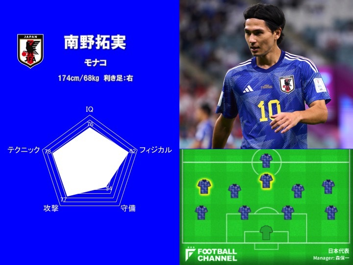 個での打開力はそこまで目立たないが、フィニッシュワークの質は日本代表内でトップクラスと言っていいだろう。味方が空けたスペースを見つける早さ、そこに入り込むタイミングの上手さを持っており、訪れたチャンスを確実に仕留める決定力の高さも備わっている。そのため、ゴールに関わるプレーのクオリティーを表す「攻撃」の数値はランキングトップ10内3位の「77.6」となっている。