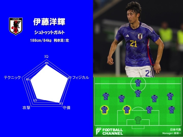 長友佑都の後を継ぐ形で左サイドバックの1番手に定着しつつある伊藤は、188cm・体重84kgとワールドクラスの体格を誇る。単純なスピード勝負では分が悪いが、フィジカルコンタクトや空中戦では確かな強さを発揮し、危機察知能力の高さを活かしたスペースカバーなどでもチームを助けている。「フィジカル」は「87.1」、「守備」は「83.0」といずれもさすがの高評価となった。