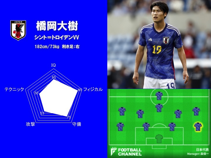 しかし、「スキル」の数値は今回の招集メンバーでワーストとなる「49.7」となった。橋岡は「攻撃」よりも「守備」に定評がある選手で、パスやクロス、ドリブルで前線に厚みをもたらすプレーを得意にしているとは言い難い。終盤の守備固めなどでは頼りになるが、日本代表のスタメンを狙っていくならば、もう少しオン・ザ・ボールで出来ることを増やしていきたいところだ。