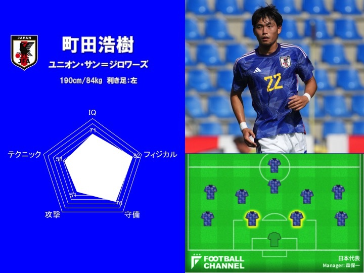 先述の通りワールドクラスの高さを誇る町田は当然ながらエアバトルに強く、セットプレー時にも大きな脅威となる。その見た目からは想像できないほどのスピードも兼ね備えるなど、「フィジカル」能力は日本トップクラスと言っていいだろう。また、大柄ながら不器用なタイプではなく、ハイクオリティーな左足を武器にビルドアップでの貢献を忘れない点も魅力だ。