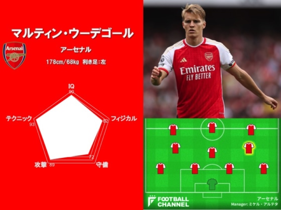アーセナル復活の象徴でもあるキャプテンのマルティン・ウーデゴールが12位にランクインした。