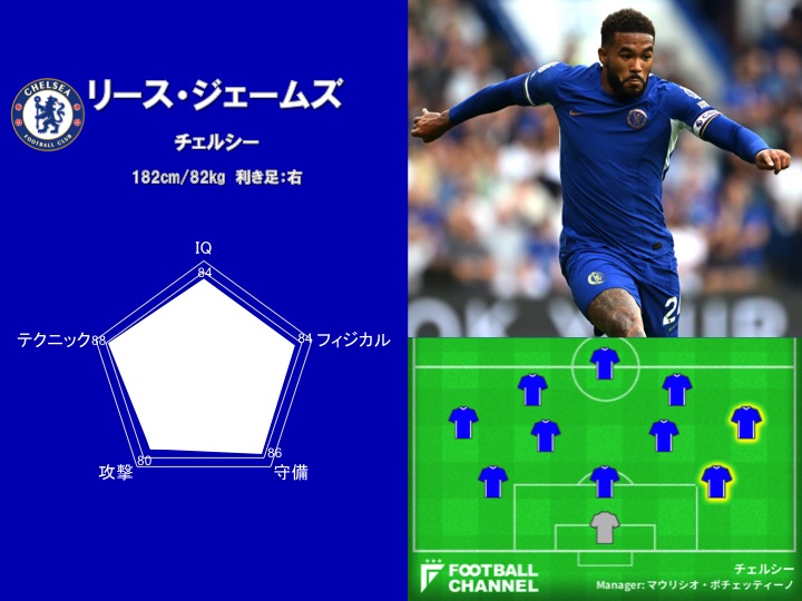 今やブルーズ(チェルシーの愛称)の象徴となったリース・ジェームズの長所は、サイドバックとして必要な能力をバランスよく兼ね備えている点だ。それは能力値にも反映されており、トップの数値は無かったものの、大きく劣る数値もなく、中盤の選手たちが上位を占めるランキングトップ20入りを果たした。