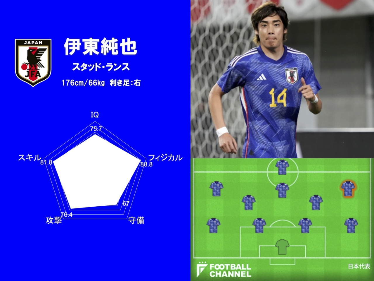 伊東の最大の特長と言えばやはり爆発的なスピードだ。なんてことないクリアボールなどを拾ってそのままチャンスに繋げてしまう突破力は理不尽極まりなく、これまで幾度となく単独で局面を打開してきた。さらに恐ろしいのは、90分間に渡り体力が落ちないことで、対戦相手からすると一瞬の気の緩みも許されない。「フィジカル」の数値は驚異の「88.8」で、今回のメンバーではトップとなっている。