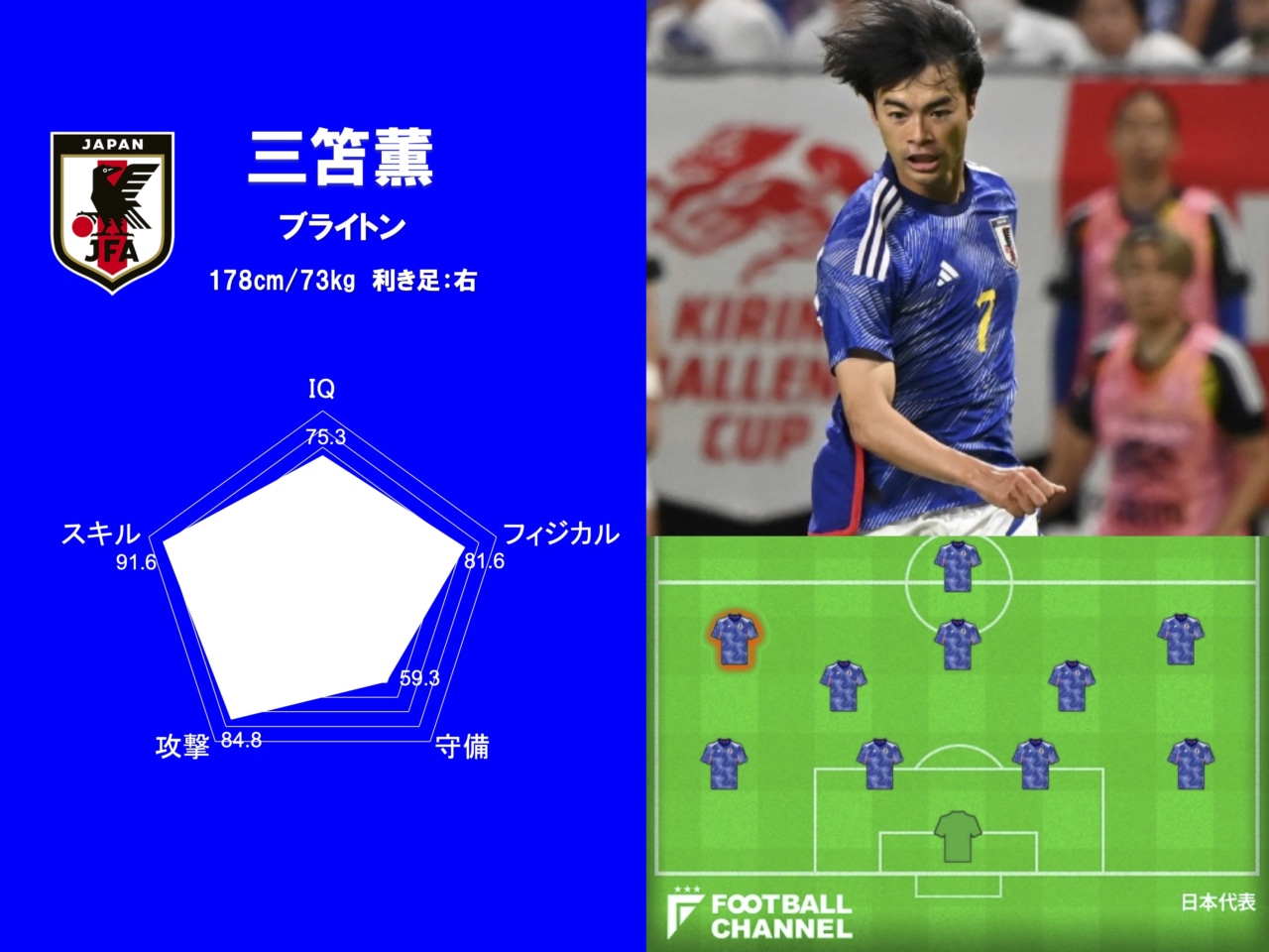 三笘のドリブル「スキル」はワールドクラスと言っていい。とくに、単純な身体能力ではなく、様々な“技術”で勝負できることが大きな凄み。緩急の使い方、切り返しの深さ、加速力のどれをとっても申し分なく、あっという間にDFを置き去りにしてしまう。これは他の日本人にはなかなか出来ない稀有な武器であり、「スキル」の数値は今回の招集メンバーで最高の「91.6」となっている。