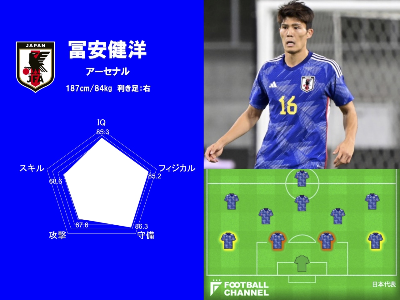冨安の身体能力の高さは歴代でもトップクラスだ。世界最高レベルのCBたちと同じく高さ、強さ、速さの3拍子が揃っており、地上・空中問わず対人戦で安定した強さを見せつけてきた。ケガの多さが最大のウィークポイントであり、「フィジカル」の数値は「85.2」とランキングトップ10内2位に落ち着いたが、それさえなければ「90」超えはまず間違いなかった。