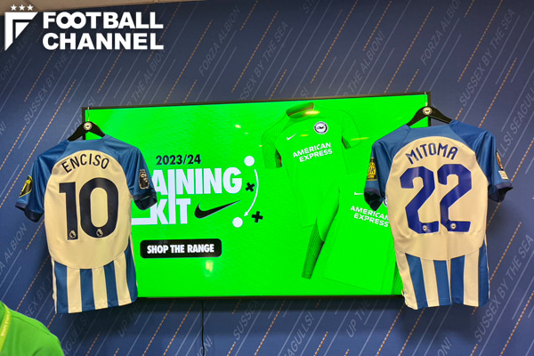 まず第一に驚いたのが入り口の一番目に入る場所に置いてある電光掲示板には、アウェイユニフォームに身を包み笑顔の三笘の写真が表示されていることだ。そしてレジに行くと当たり前のように、10番エンシソとともに、22番ミトマのユニフォームが飾られている。