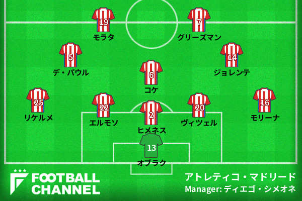 アトレティコ・マドリード、ラツィオ戦の予想フォーメーション