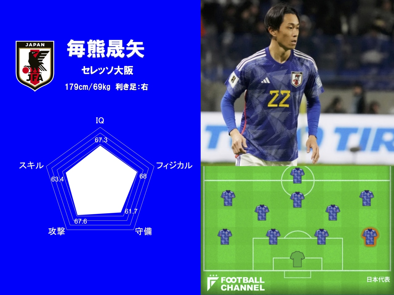 一方で、「守備」が「61.7」とやや低く、まだ対人守備の寄せの甘さなど課題は山積みだ。日本代表デビュー戦となった昨年のトルコ代表戦では、相手に寄せるも止められず、最後はたまらずファウル。そこで与えたFKから失点を招いてしまった。今後長く国際舞台で活躍する上で、レベルアップは欠かせない。
