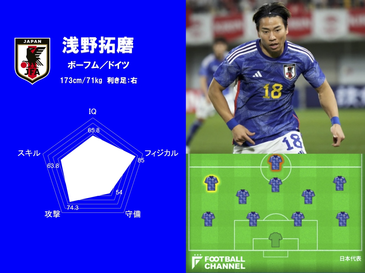 浅野の最大の特徴といえば爆発的なスピードで、それを含めた「フィジカル」の数値は「85」となった。相手DFを一瞬で置き去りにし、あっという間にゴールへ迫ることができる。そのスピードで世界トップレベルが揃うドイツ代表を苦しめた。