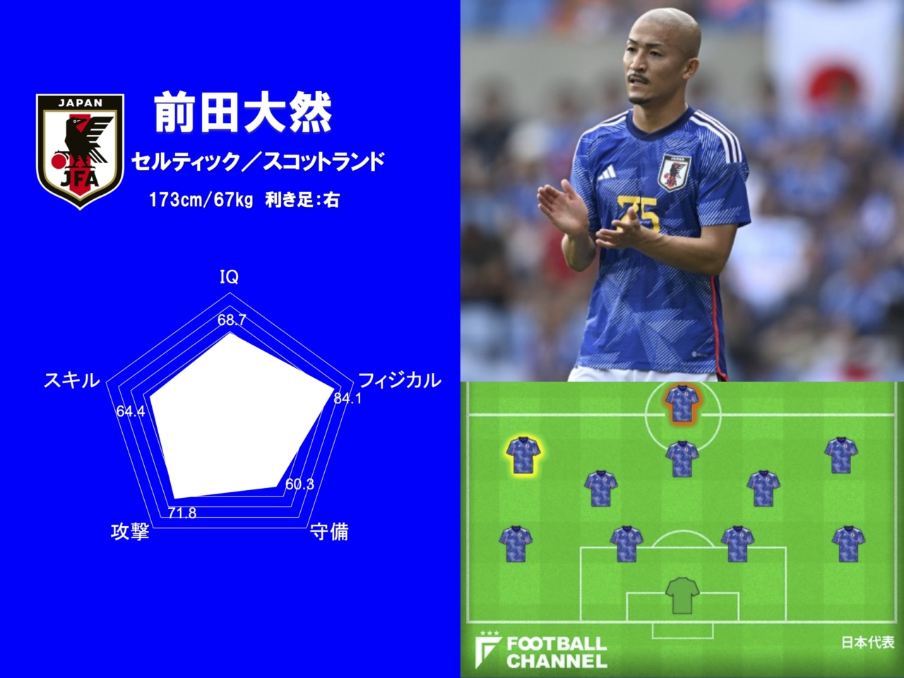また、スピードを活かした守備も特徴的。「守備」の数値は60.3とFWの選手としては高い。スプリントを何度も繰り返し、1試合の間に幾度も前線からプレッシャーをかける。『FIFA』の公式によると、カタールワールドカップの決勝トーナメント1回戦クロアチア代表戦で、前田は途中交代ながらも、68回ものスプリントを行っていた。攻守において、労力を惜しむことなくチームの勝利のために走り続けるということがよく分かる。