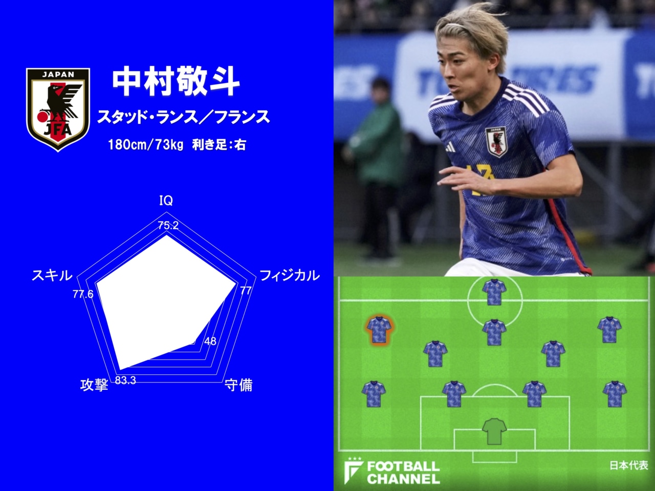 それでも中村には特別な武器がある。他の代表メンバーを凌ぐほどのシュートセンスだ。ボックス内での落ち着きぶりはストライカー並みで、ボックス外からも高確率で枠内シュートを飛ばすなど、ワンチャンスを仕留める力は圧倒的。日本代表ではここまで6試合6ゴールとその能力を余すことなく発揮している。決定力などゴールに関わる能力をさす「攻撃」は「83.3」と飛び抜けたものになった。