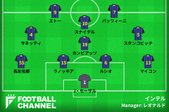 長友は加入後しばらくベンチスタートとなったが、2月のフィオレンティーナ戦で初先発を飾ると、そこから主力に。チャンピオンズリーグ(CL)の準々決勝では内田篤人との日本人対決を実現させた。また、コッパ・イタリアでは準決勝の2試合でフル出場を達成。決勝のパレルモ戦は右サイドバックとしてフルタイムプレーし、タイトル獲得に貢献している。このシーズン終了後、長友はインテルへの完全移籍を勝ち取ることになった。