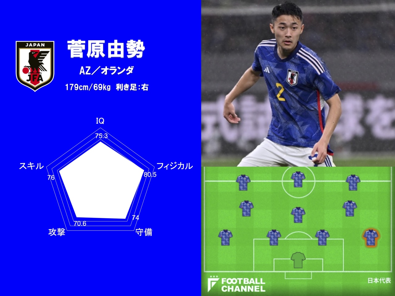 2022年に行われたカタールワールドカップの出場こそ逃した菅原由勢だが、2023年3月より始動した第2次森保一政権で右SBのレギュラーの座を射止めた。ところがAFCアジアカップ2023では万全のコンディションじゃなかったことも影響して精彩を欠く場面が多く、グループリーグ第3節以降は出番が訪れなかった。