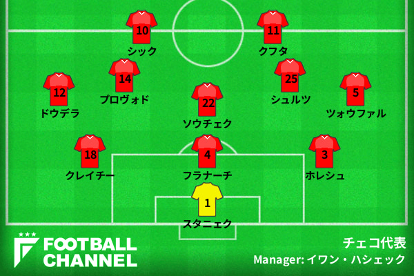UEFAユーロ2024(EURO2024)・グループリーグF組第1節、ポルトガル代表対チェコ代表が現地時間18日(日本時間19日 4:00KO)にツェントラールシュタディオンで行われる。この試合に先立ち、チェコ代表のスターティングメンバーが発表されている。