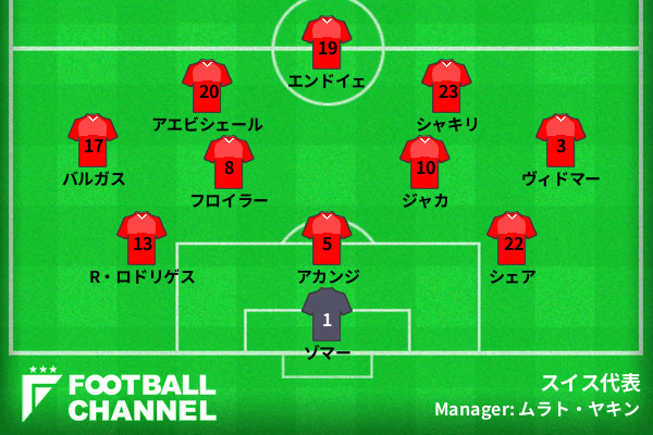 ハンガリー戦からの変更は1名。クワドオ・ドゥアーがベンチとなり、ジェルダン・シャキリが入っている。