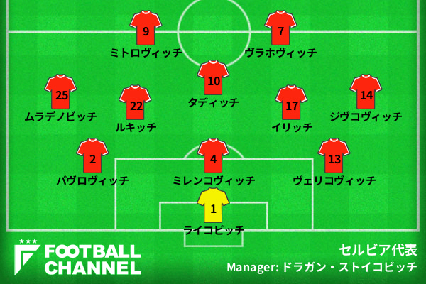 前節のイングランド代表戦からの変更は2人。フィリップ・コスティッチとセルゲイ・ミリンコヴィッチ=サヴィッチが外れ、ドゥシャン・タディッチとフィリプ・ムラデノビッチがスタメンに名を連ねている。