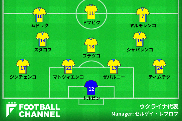 敗れたルーマニア代表戦から大幅に変更。勝利が必要な状況で、攻撃的な布陣で挑む。また、今季レアル・マドリードで活躍したGKアンドリー・ルニンがスタメンから外れている。