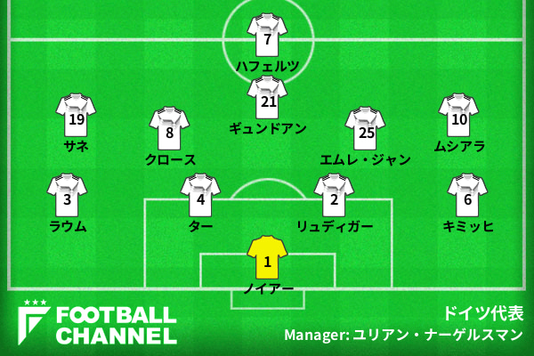 スタメンには、エムレ・ジャンやレロイ・サネが名を連ねている。自国開催での優勝を目指すドイツ代表にとって大一番となる一戦に挑む。