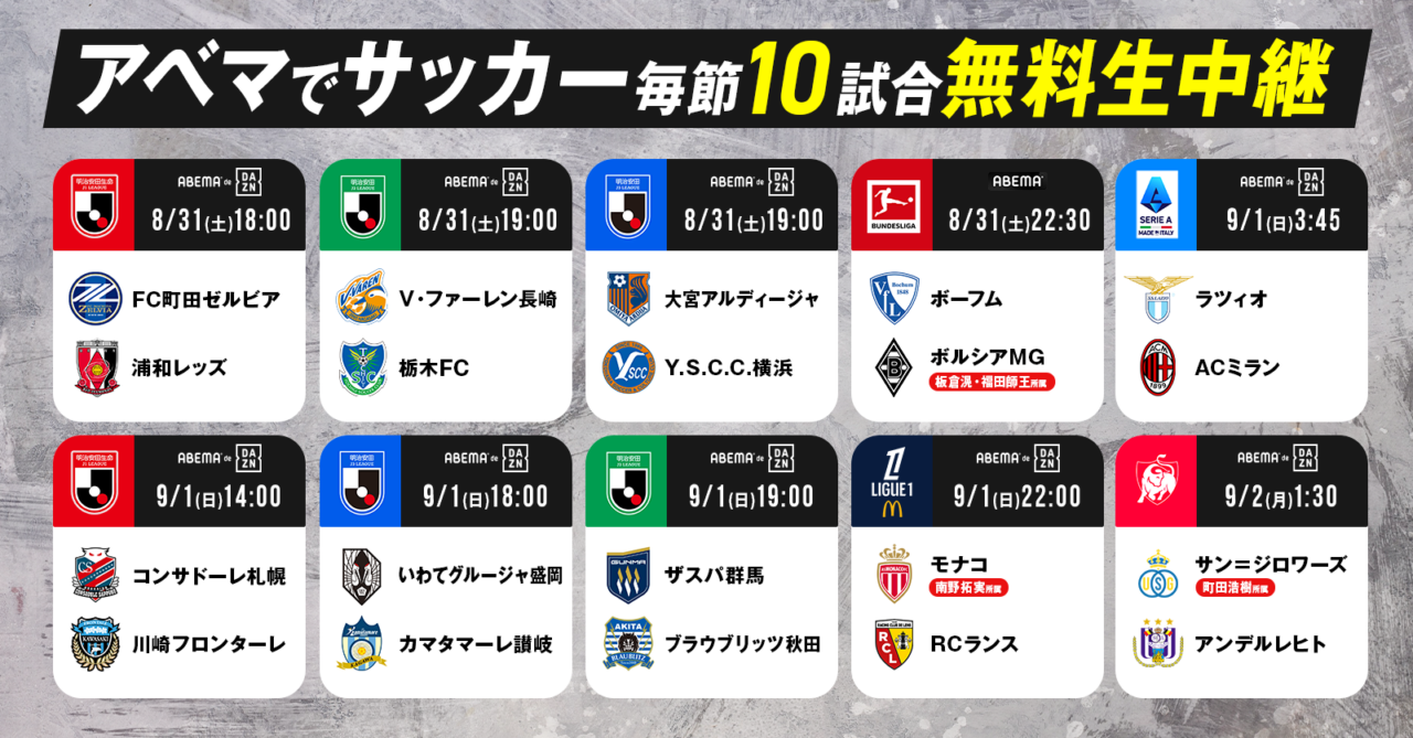 インターネット放送局「ABEMA(アベマ)」は30日、ドイツのブンデスリーガやフランスのリーグ・アンなどの欧州サッカーリーグに加え、明治安田Jリーグの毎節10試合を無料生中継することを発表した。それに伴い、8月31日から9月2日の3日間で無料生中継する試合を公表している。