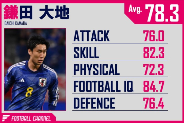 6位にランクインした鎌田だが、クラブで苦しんでいる理由のひとつは、今回の能力値の項目にもある「フィジカル」ではないだろうか。72.3という数値は日本代表の中でも低いものとなっている。