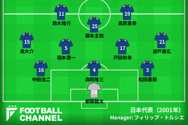 ゴールキーパーを任されたのは、当時23歳の都築龍太。トルシエジャパンの肝である「フラットスリー」は、1年後のW杯本大会でもプレーした松田直樹(24歳)、森岡隆三(25歳)、中田浩二(22歳)が務めた。他にも“W杯組”では稲本潤一(22歳)や戸田和幸(23歳)、鈴木隆行(25歳)らが先発に名を連ねている。