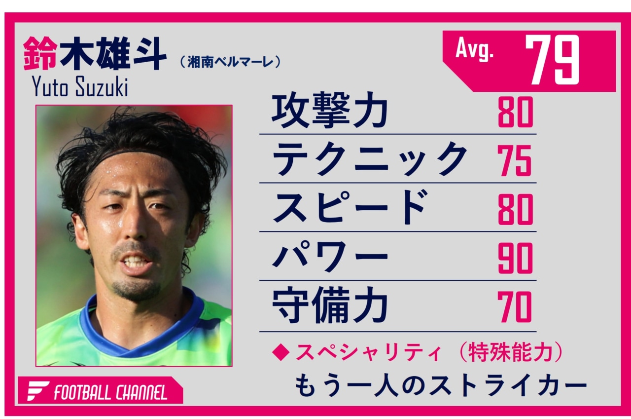 今シーズンはJリーグ屈指のスピードを誇る藤井智也が加入したため、鈴木は1つ下がった右センターバックから攻守を支える存在となっている。湘南のアグレッシブなスタイルを90分続けるための生命線だ。加入2年目ながら、若い選手が多い湘南では兄貴分的な存在でもある。