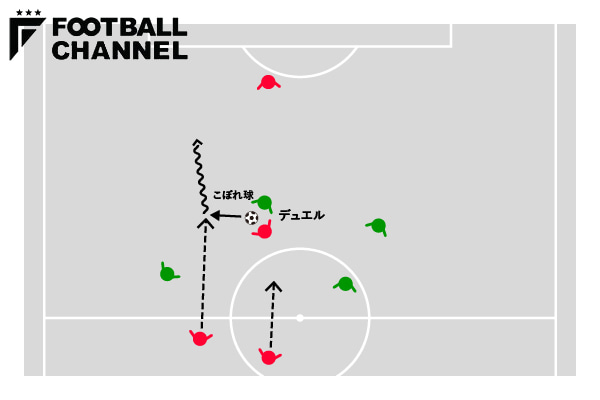 中盤の選手やDFラインの選手たちは押し上げる(「Nachrücken」=ナッハリュッケン)と同時に、ボールロストした際を想定して、カウンターの起点になりそうな相手選手たちをしっかりとマークしておきます。これらのアクションによりセカンドボールを拾い、または即時のゲーゲンプレスを発動しやすくします(「Restverteidigung」:レストフェアタイディグング=リスクマネジメント) 。