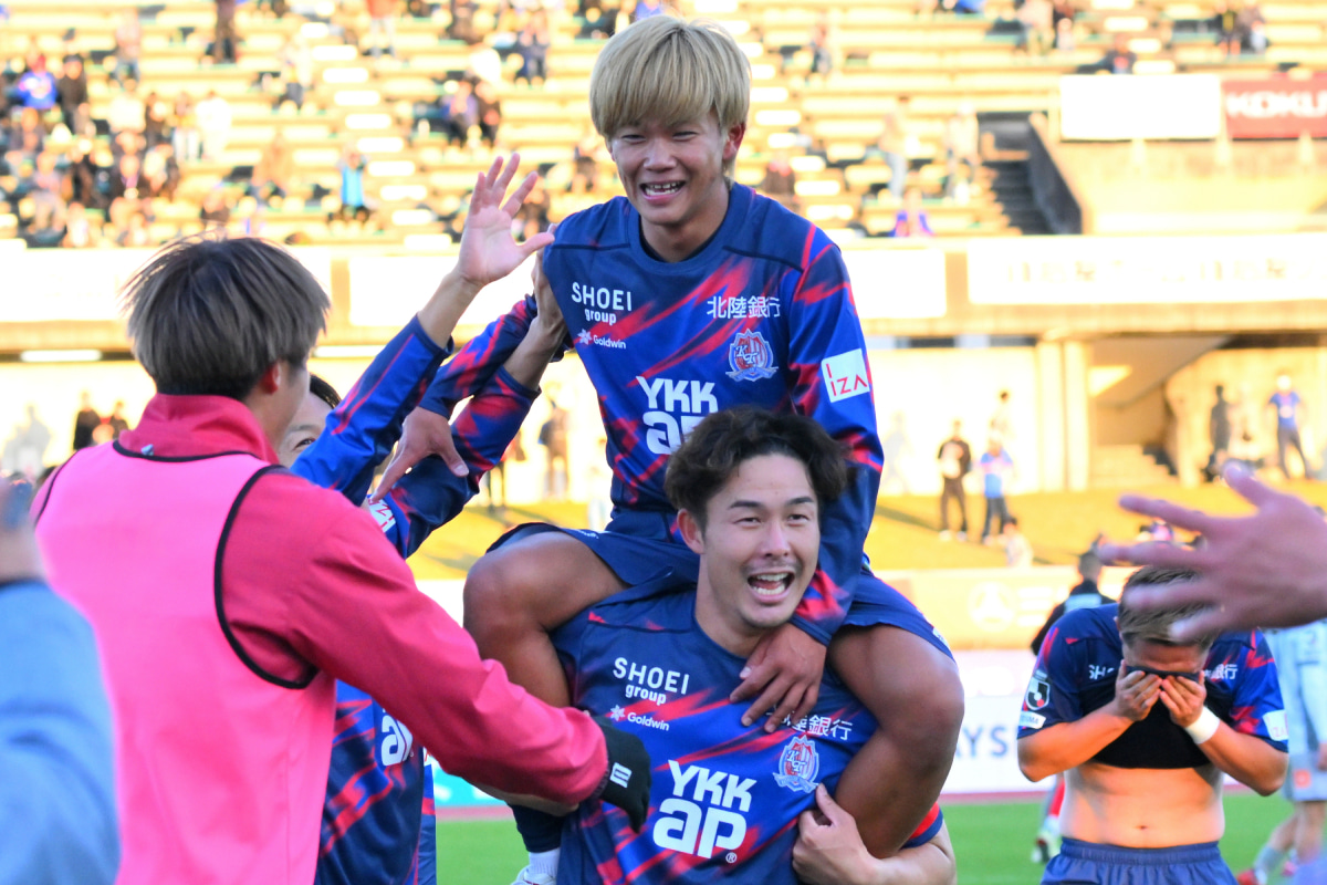 この劇的な得点で4-1で勝ち切った富山。熊本が甲府とスコアレスドローで試合を終えていたため、得失点差で「1」上回り、奇跡の残留を果たした。
