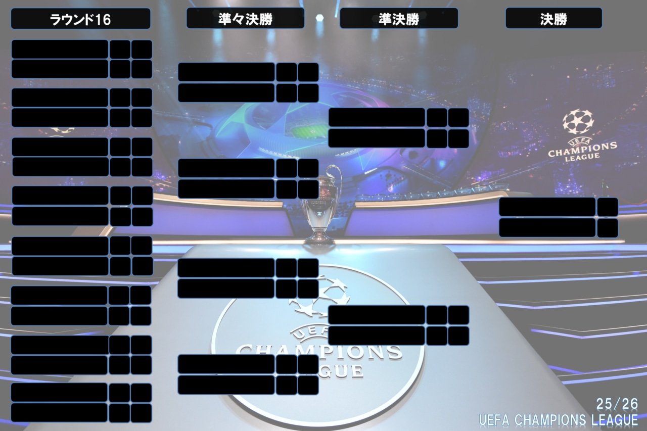 UEFAチャンピオンズリーグ2025/26(欧州CL)の決勝トーナメント表は下記の通り。リーグフェーズ9〜24位のチームがプレーオフを戦い、勝利した8チームがラウンド16でリーグフェーズ1〜8位のチームと対戦する。プレーオフ〜準決勝まではホーム&アウェイで行われ、決勝のみ一発勝負に。スコアが並んだ場合は15分ハーフの延長戦を実施。延長戦でも決着がつかない場合はPK戦に突入する。