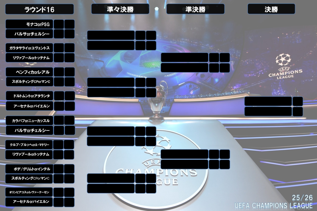 UEFAチャンピオンズリーグ2025/26(欧州CL)の決勝トーナメント表は下記の通り。リーグフェーズ9〜24位のチームがプレーオフを戦い、勝利した8チームがラウンド16でリーグフェーズ1〜8位のチームと対戦する。プレーオフ〜準決勝まではホーム&アウェイで行われ、決勝のみ一発勝負に。スコアが並んだ場合は15分ハーフの延長戦を実施。延長戦でも決着がつかない場合はPK戦に突入する。