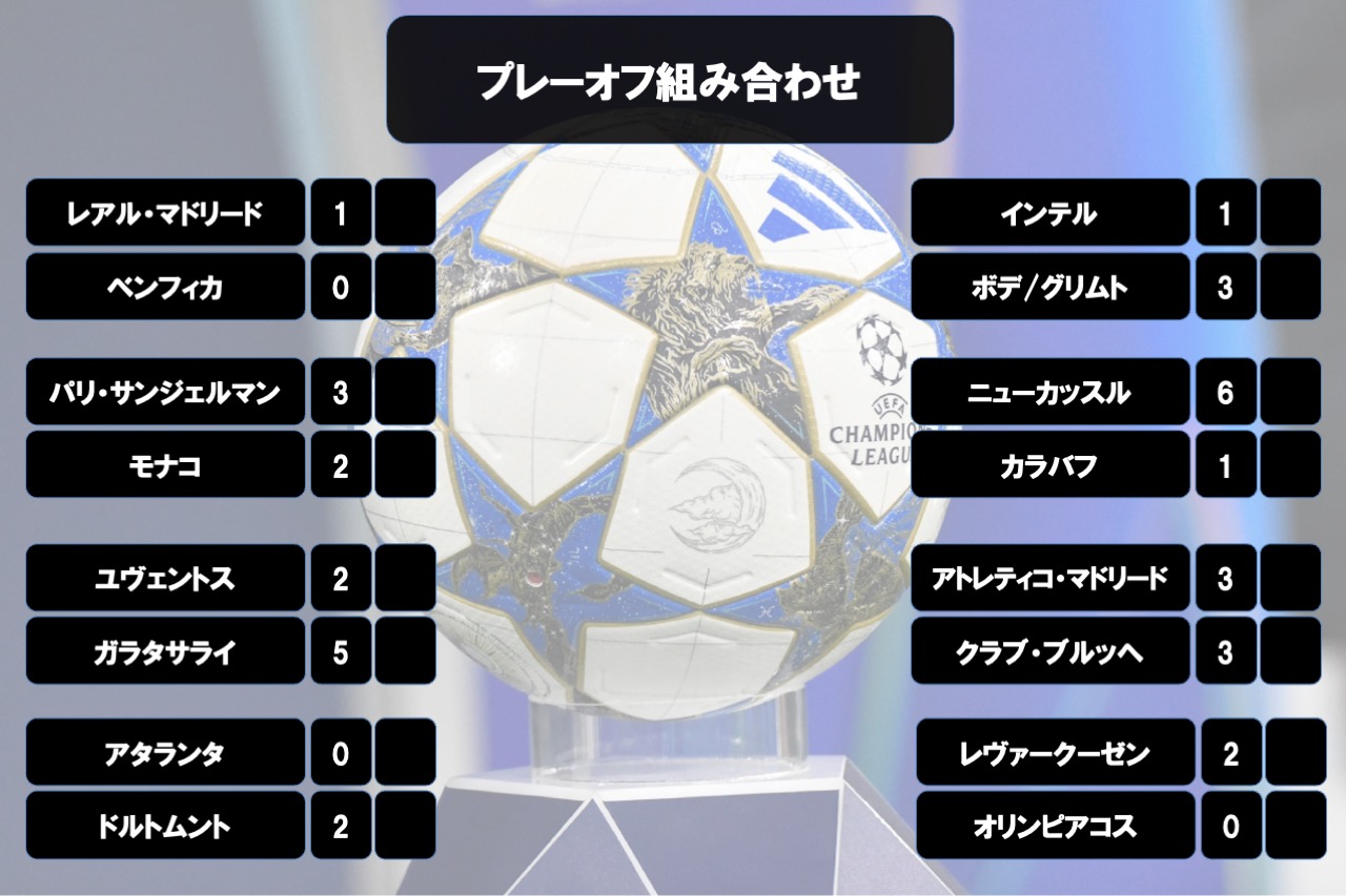 UEFAチャンピオンズリーグ2025/26(欧州CL)の決勝トーナメント表は下記の通り。リーグフェーズ9〜24位のチームがプレーオフを戦い、勝利した8チームがラウンド16でリーグフェーズ1〜8位のチームと対戦する。プレーオフ〜準決勝まではホーム&アウェイで行われ、決勝のみ一発勝負に。スコアが並んだ場合は15分ハーフの延長戦を実施。延長戦でも決着がつかない場合はPK戦に突入する。